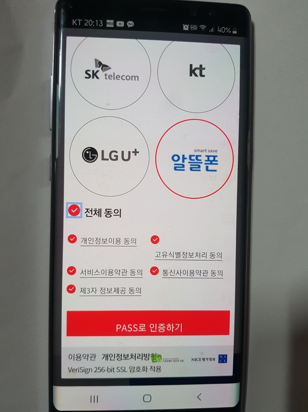 PASS가입절차: 최초 실행시 약관 동의하기,비밀번호 설정 진행하기